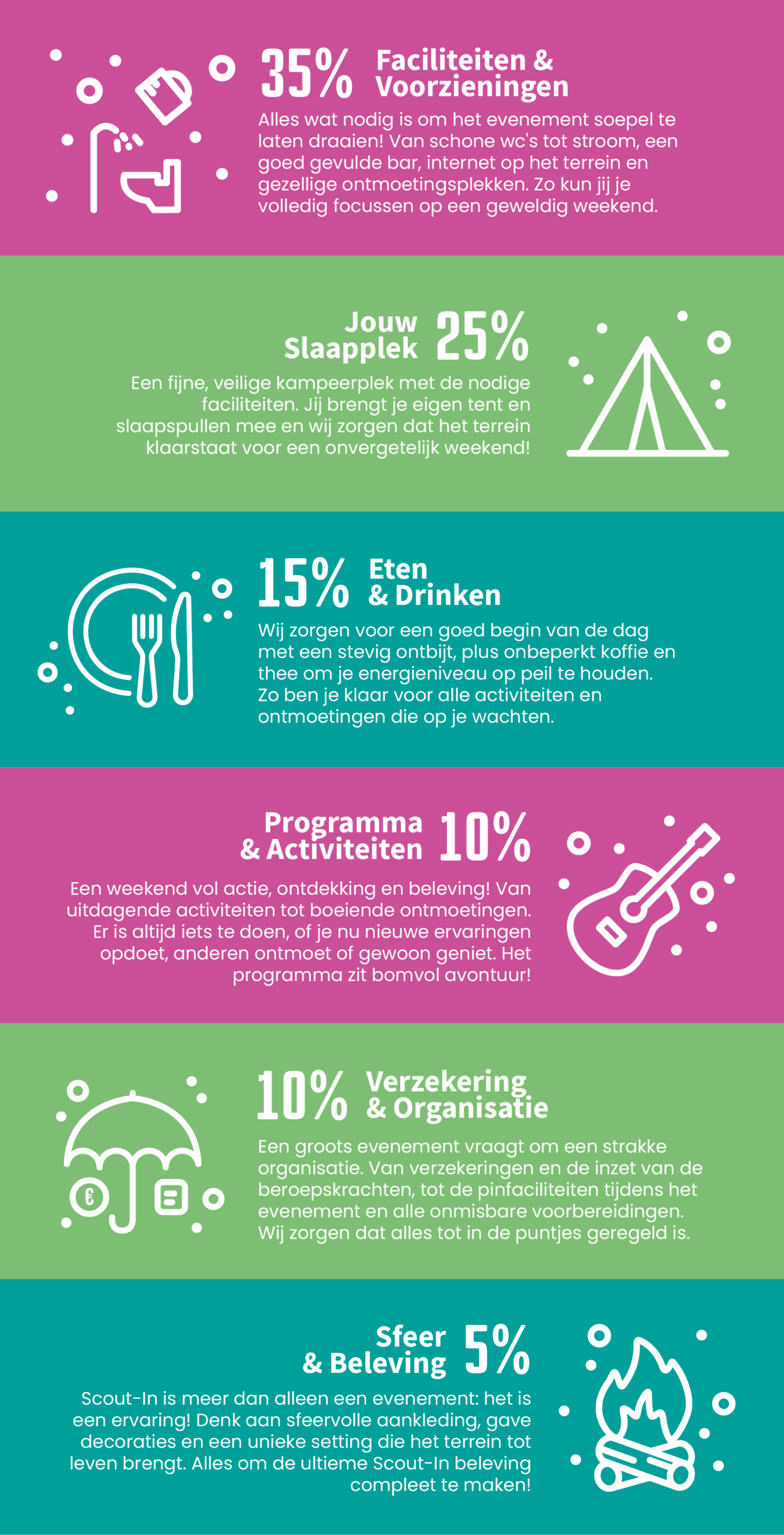 Het organiseren van een evenement brengt veel kosten met zich mee, vooral in deze tijden van stijgende prijzen. Als organisatieteam van Scout-In25 doen we ons uiterste best om voor zo weinig mogelijk geld zo veel mogelijk waarde te bieden. Op deze pagina vind je een overzicht van waar de deelnemersbijdrage aan wordt besteed.